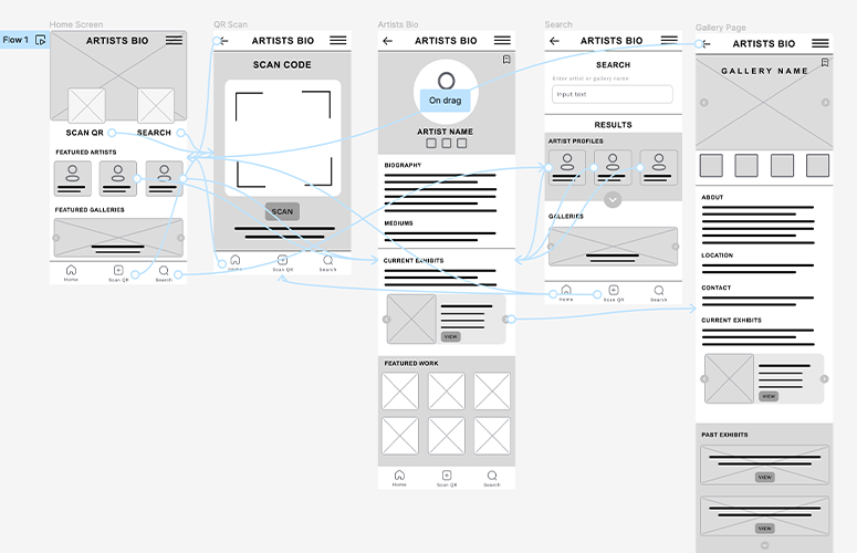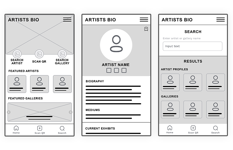 Low-fidelity prototype connected the primary user flow of scanning a QR or searching an artist so the prototype could be used in a usability study.