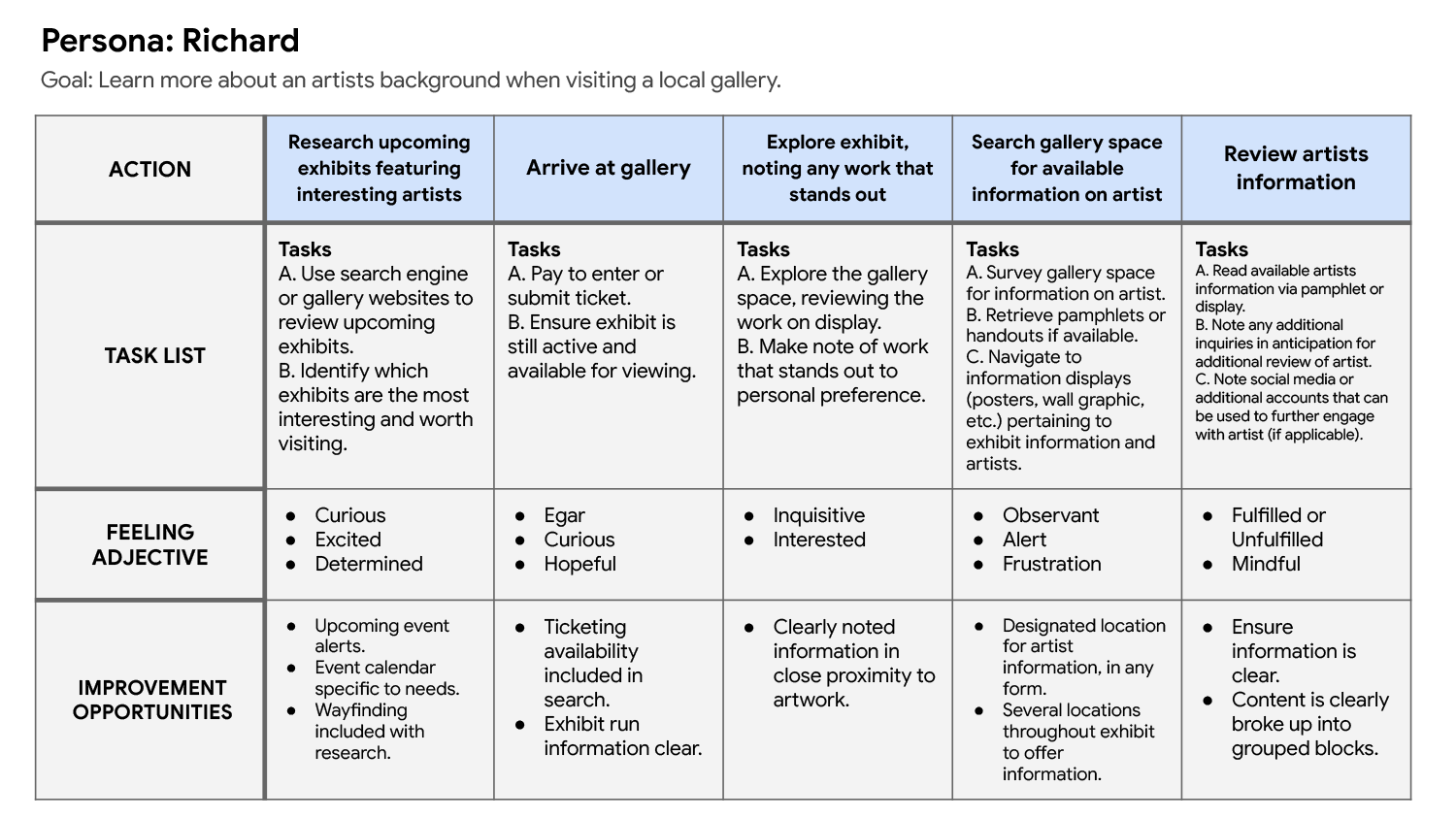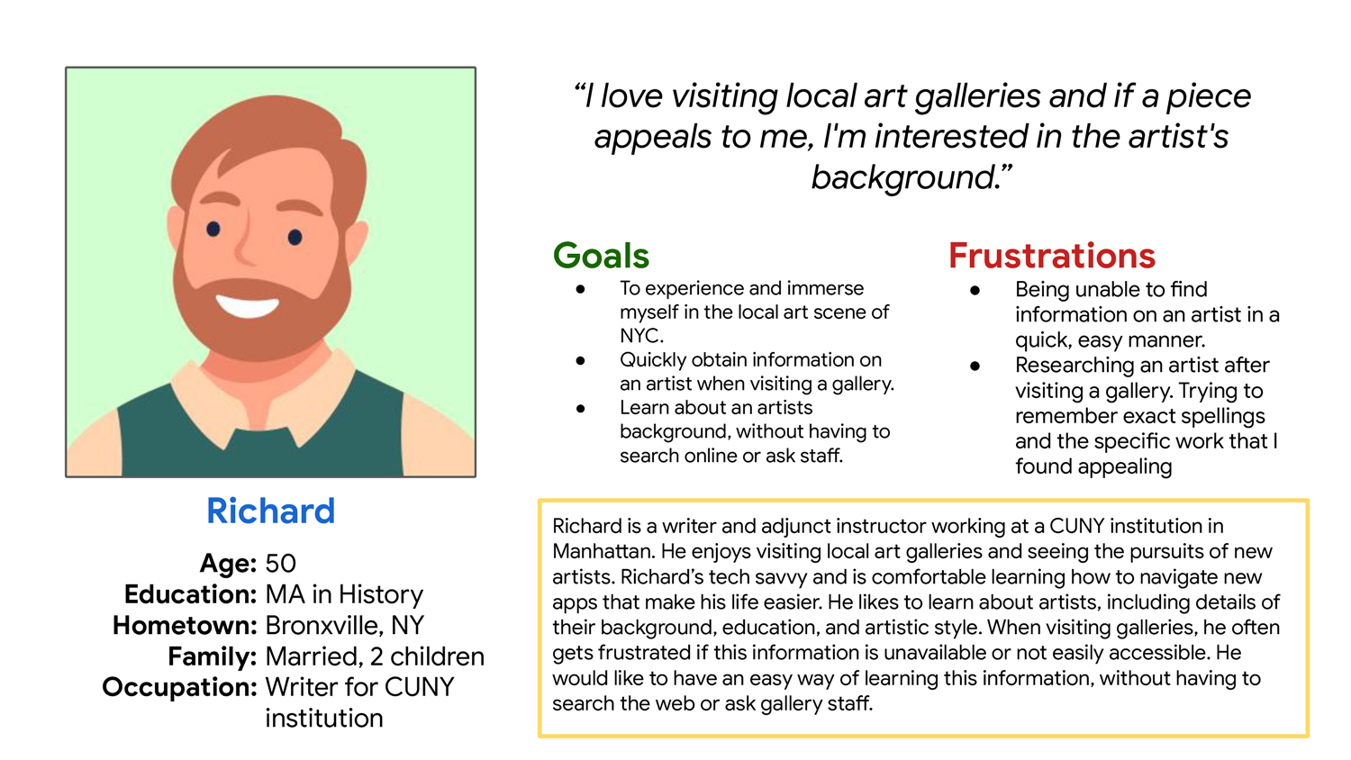 Richard: Richard is a frequent gallery visitor who wants a simple method for learning background information on featured artists, because obtaining these details can be challenging or confusing in some gallery settings.