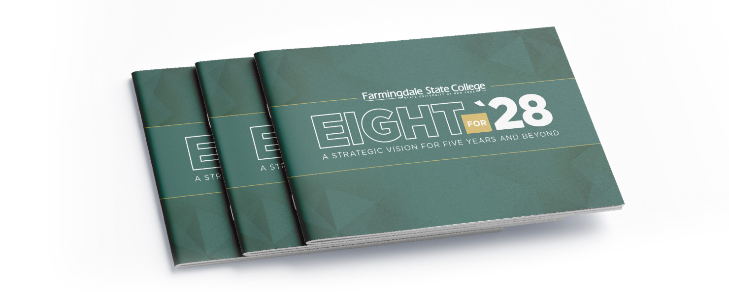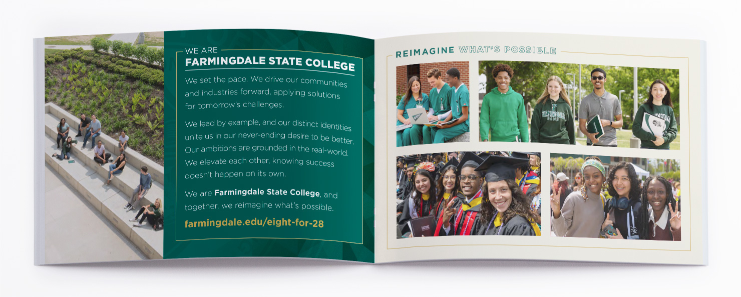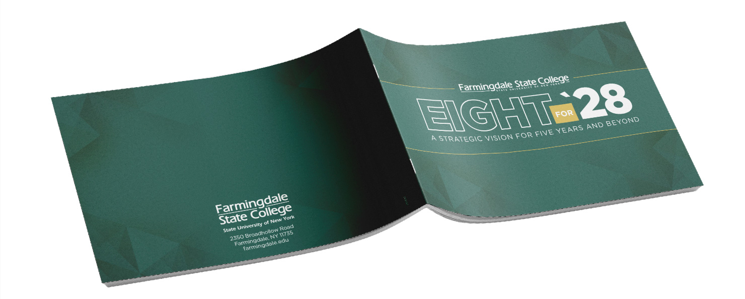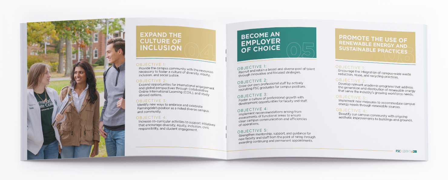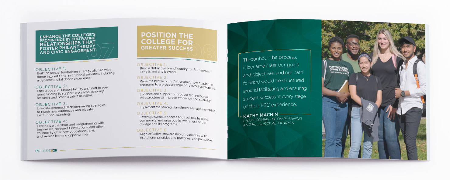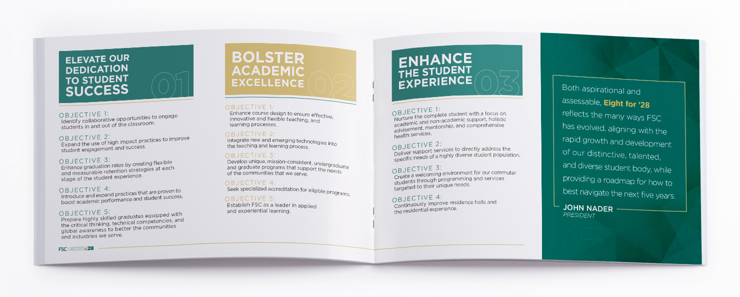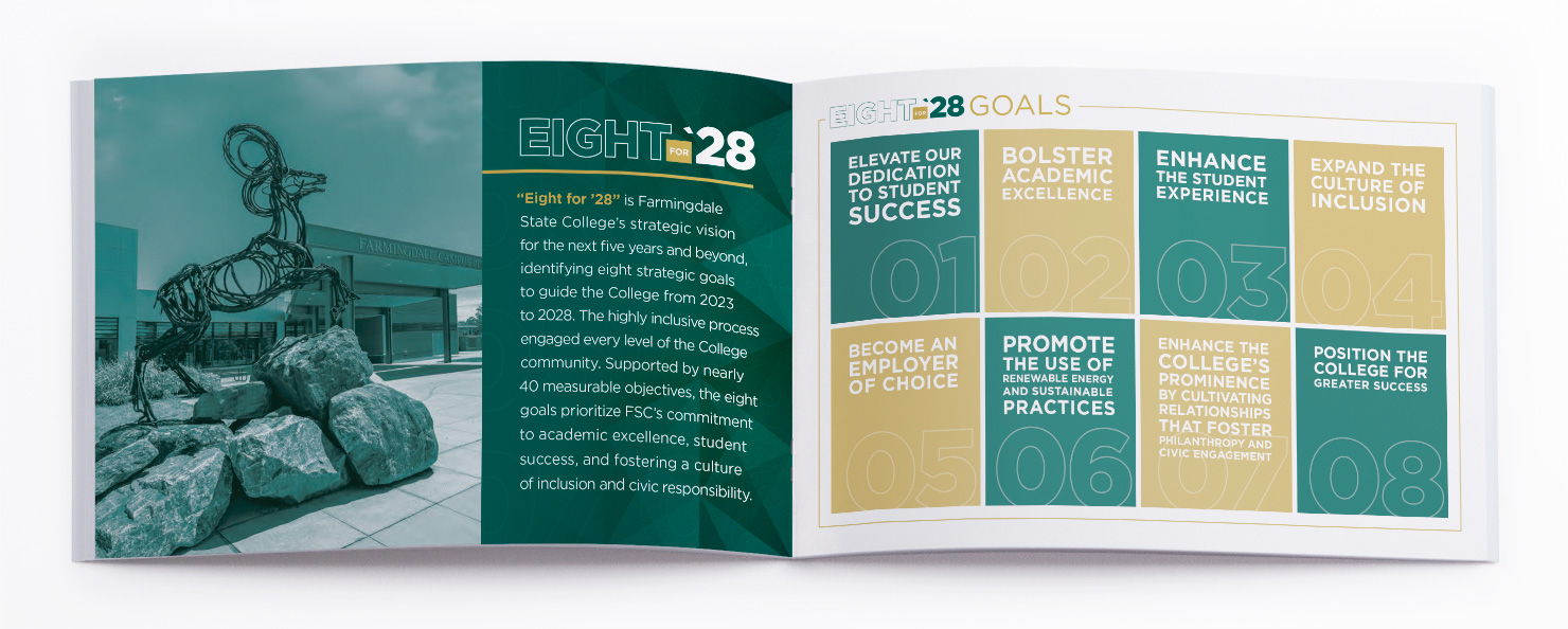 The FSC strategic plan brochure, titled “Eight for ’28,” was developed using various component from FSC’s visual identity, including colors, imagery, and type treatments. A landing page was also developed, incorporating the same material and aesthetics from the brochure. Click here to view the website and brochure.