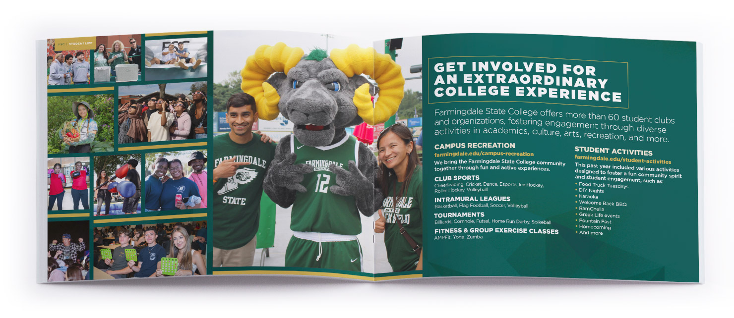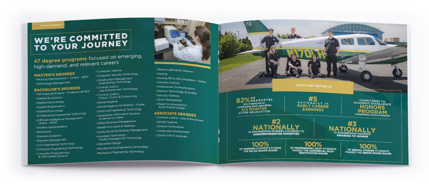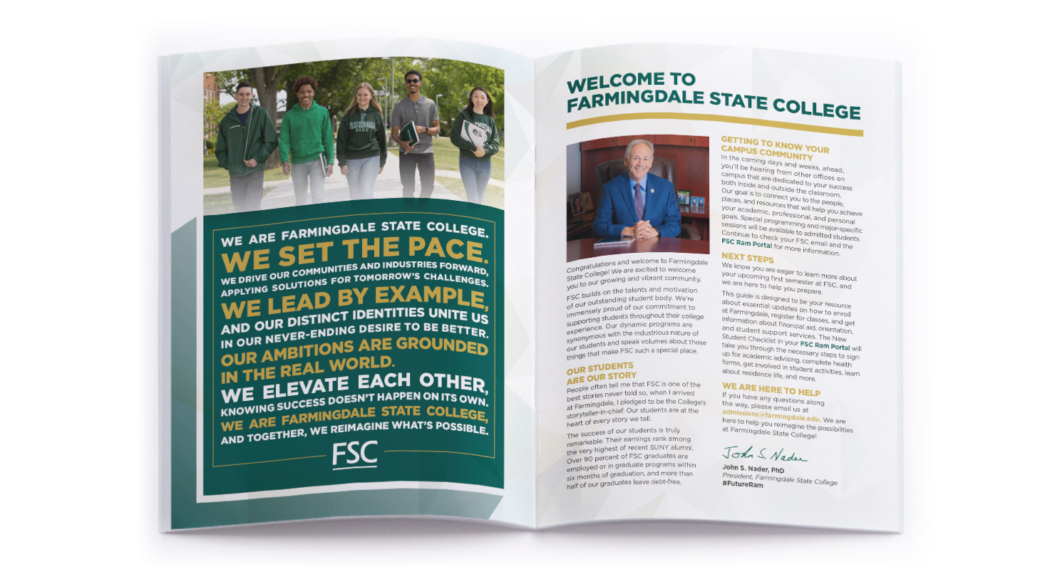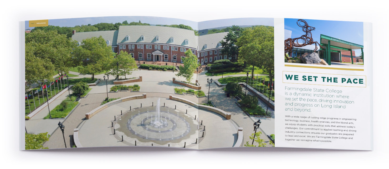 The FSC viewbook is a horizontal brochure showcasing the college’s academic programs, hands-on learning, and vibrant campus life. Featuring dynamic photography and stylized section treatments, it captivates viewers and sparks interest in the college experience.