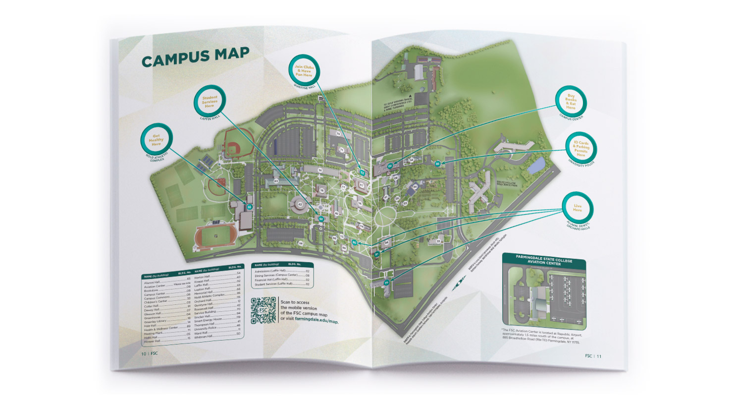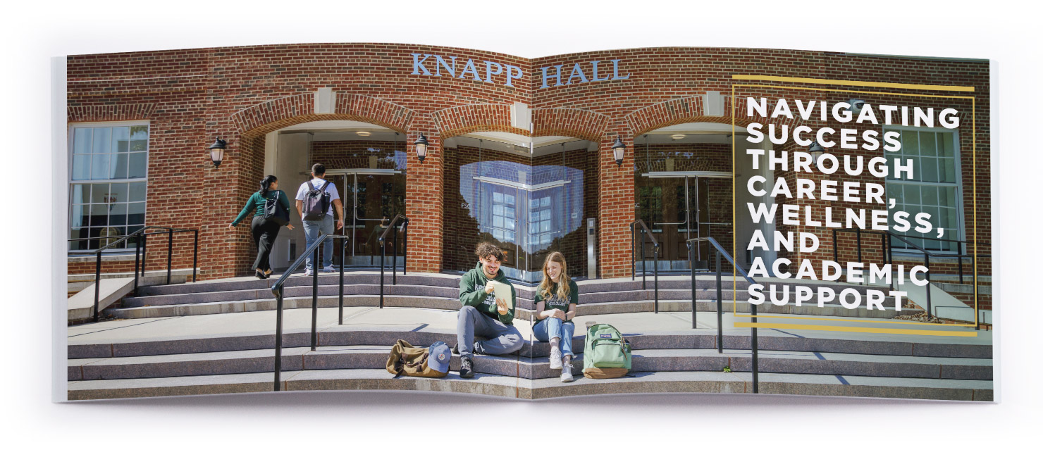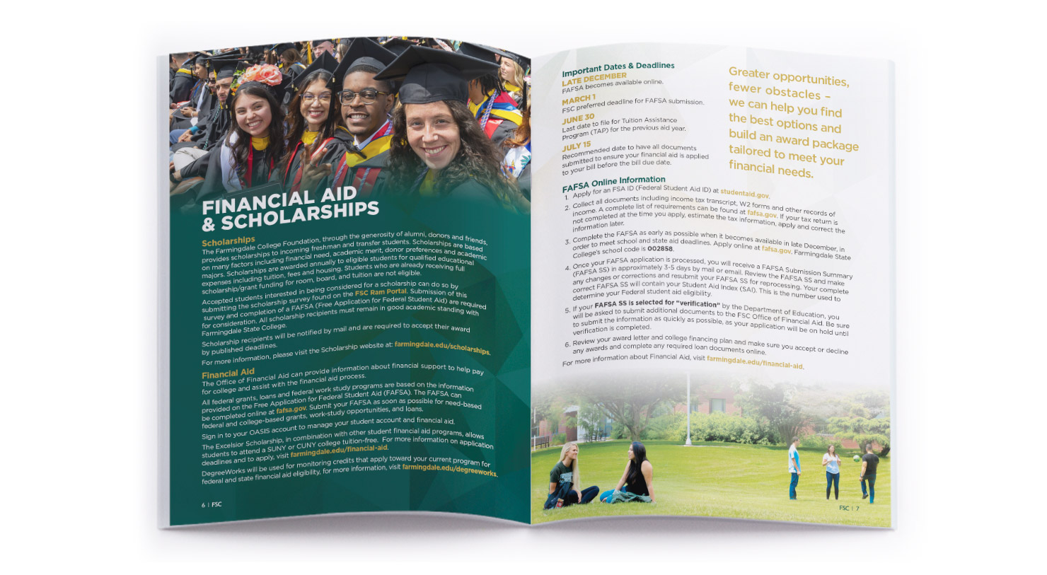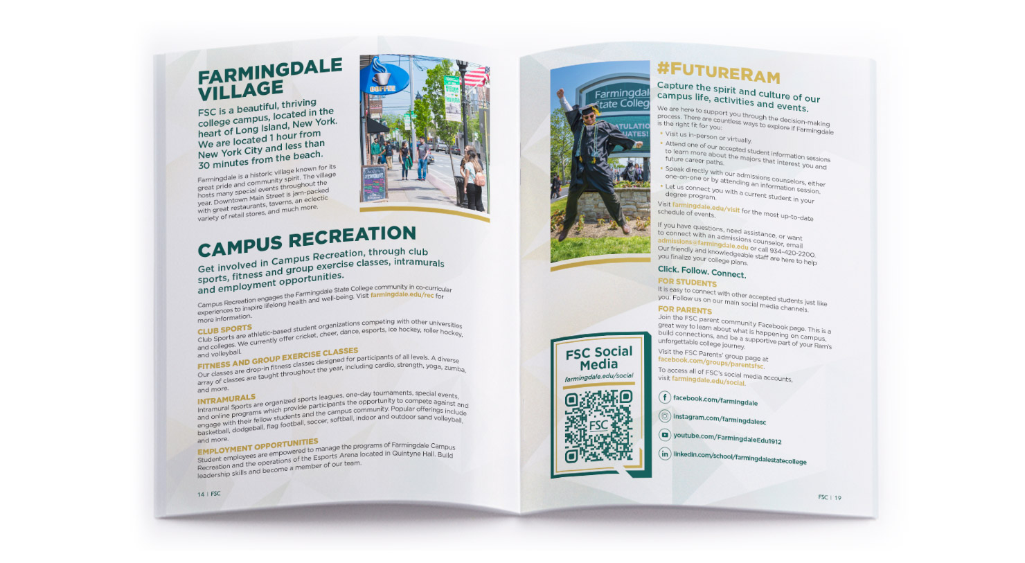 The FSC viewbook is a horizontal brochure showcasing the college’s academic programs, hands-on learning, and vibrant campus life. Featuring dynamic photography and stylized section treatments, it captivates viewers and sparks interest in the college experience.