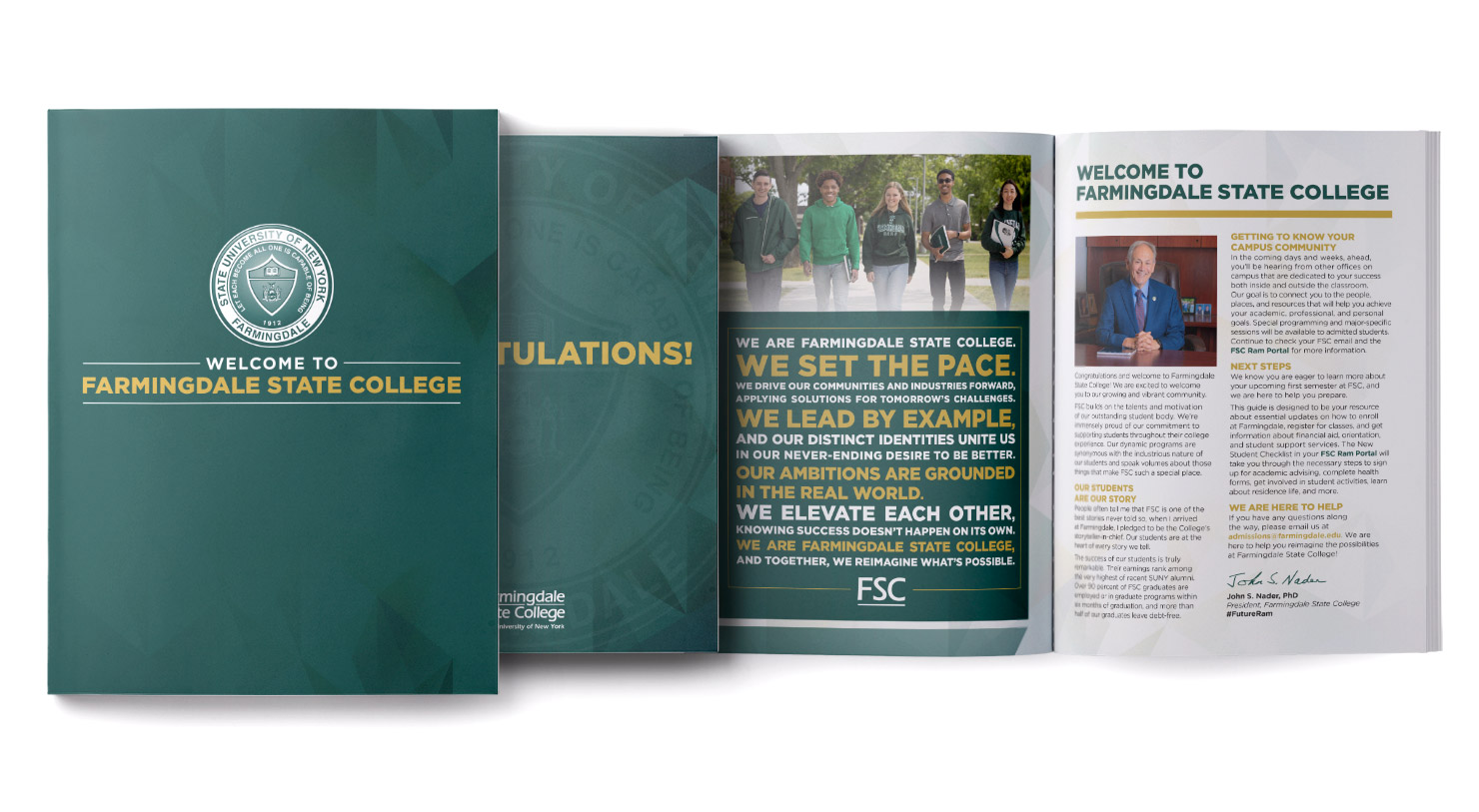 The Farmingdale State College acceptance package was a multifaceted project used to inform students of their acceptance to the college. The package includes a custom die cut envelope, a 28 page booklet and a distinct outer envelope. The elaborate components are intended to draw attention and differentiate FSC from other colleges.