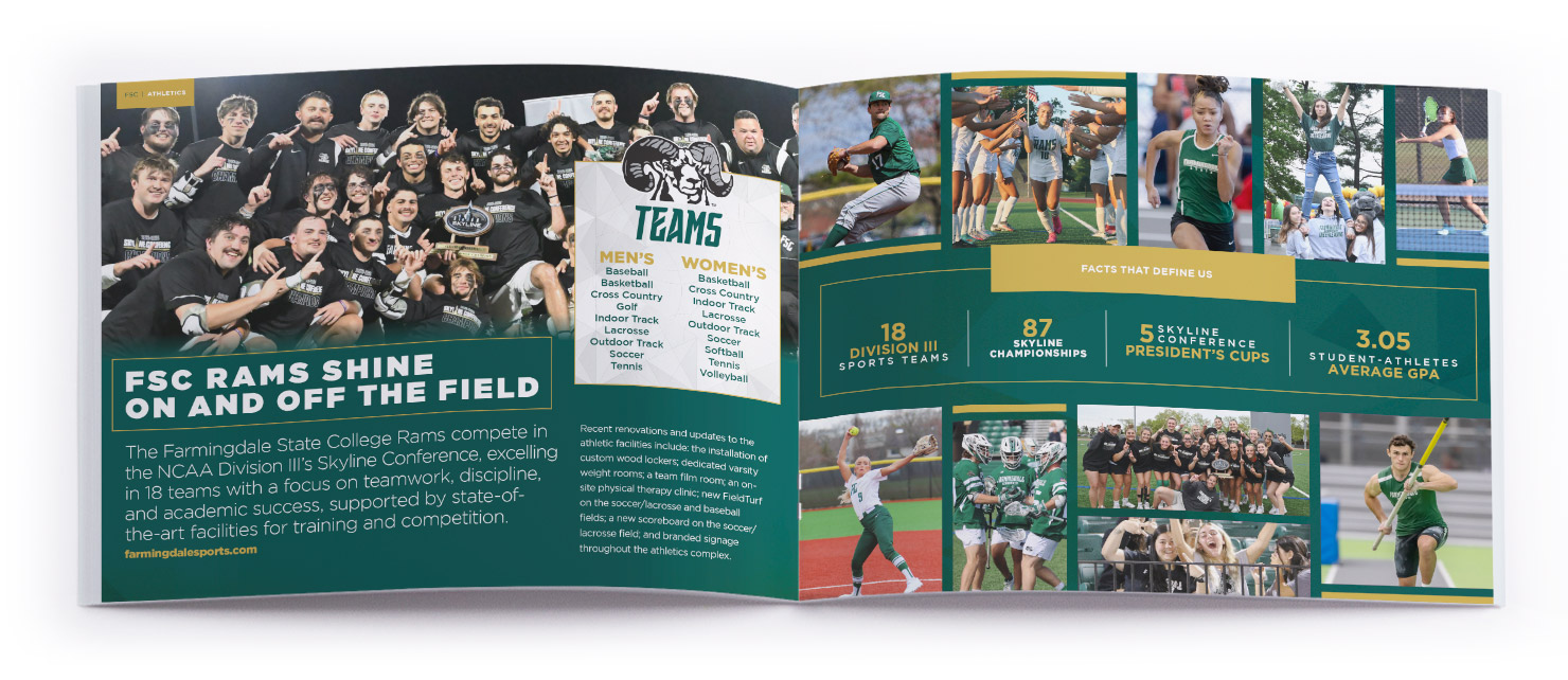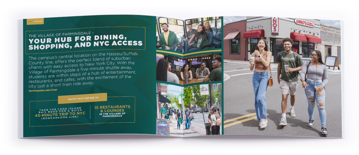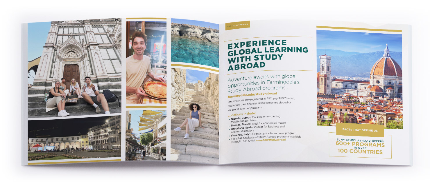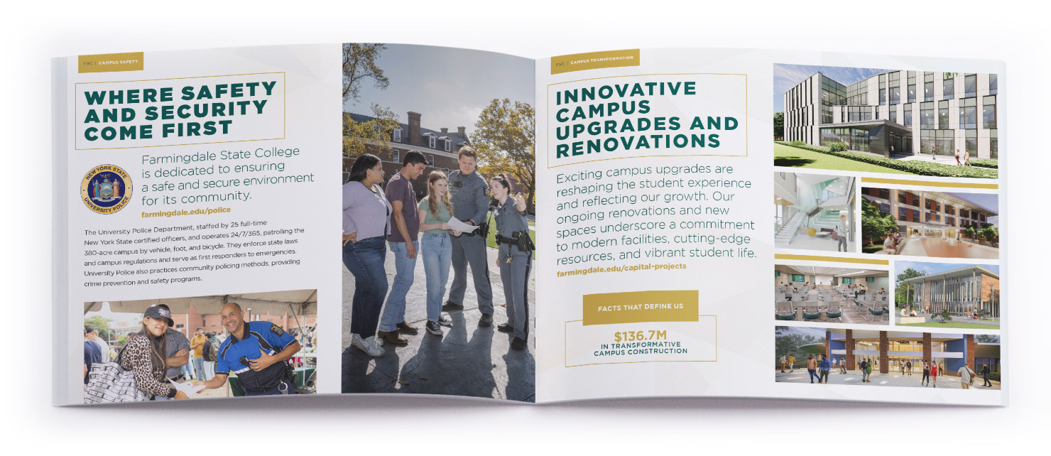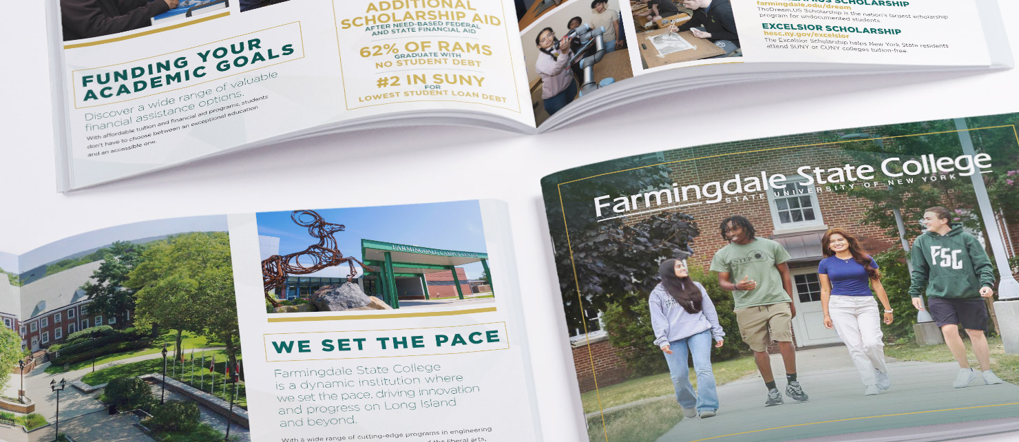 Collaborating with internal teams at Farmingdale State College, I developed impactful printed materials such as brochures and mailers to attract prospective students and strengthen connections with current students. By enhancing imagery and refining layouts, I created engaging collateral that boosted engagement, supported retention, and won multiple national design awards, elevating the institution’s reputation.